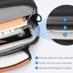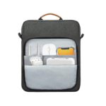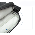 El bolsillo secundario frontal posee un cremallera unidireccional y su cierre es metálico de color gris claro. Mide 25.5cm de alto x 21cm de ancho, su interior está elaborado de tafeta de poliéster posee una ranura cuadrada en la que podrás colocar cargadores, discos duros, etc. Mas 2 compartimientos para esferos o apple pencil.