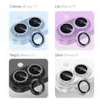 Fabricado en vidrio templado ultratransparente con marco de aleación premium, ofrece una cobertura resistente y discreta que mantiene intacta la estética original de tu iPhone. Su diseño individual asegura un ajuste perfecto en cada cámara, sin interferir con el flash ni con el enfoque.
