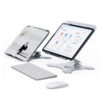 La solución para los dolores de cuello y espalda de quiénes por su trabajo pasan horas frente a ordenadores. Este soporte de aluminio además de ser giratorio 360 grados, se puede plegar hasta 180 grados conforme a tu comodidad. Incluye unos bien pensados rectángulos de silicon en donde descansará tu computador evitando rayones.