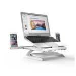 Nuestro soporte plegable y ergonómico es ideal para tus jornadas de trabajo en casa con tu MacBook, esta realizado en plástico resistente y ligero. Se adapta a la altura que la necesites y cuenta con dos brazos desplegables para que te puedas colocar tus otros dispositivos como iPhone o iPad y tenerlos siempre a la vista mientras los cargas.