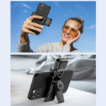 El soporte en donde reposa el teléfono es tipo vincha expansible giratorio 360°, compatible con dispositivos de hasta 6.8", lo hemos puesto a prueba con un iPhone 15 Pro Max con case y calza perfecto. Sobre una de las vinchas encontraremos una pequeña luz Led de forma cuadrada.